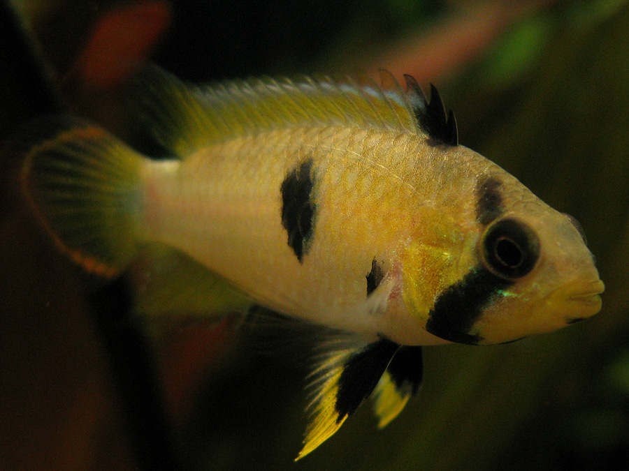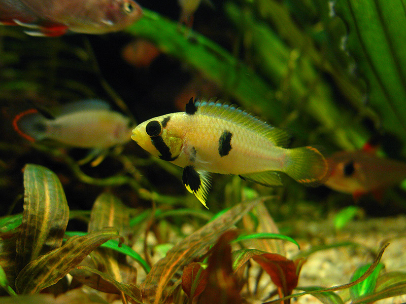 Насчет соседей - лучше мелочь харациновую и т.п. Рыбки, в отличие от других карликовых цихлид, пусть и таких же молодых, пока очень скромно себя ведут, не в состоянии дать отпор даже рамирезкам. Самка понаглее, самец совсем тихий. Думаю, что это временно, конечно.