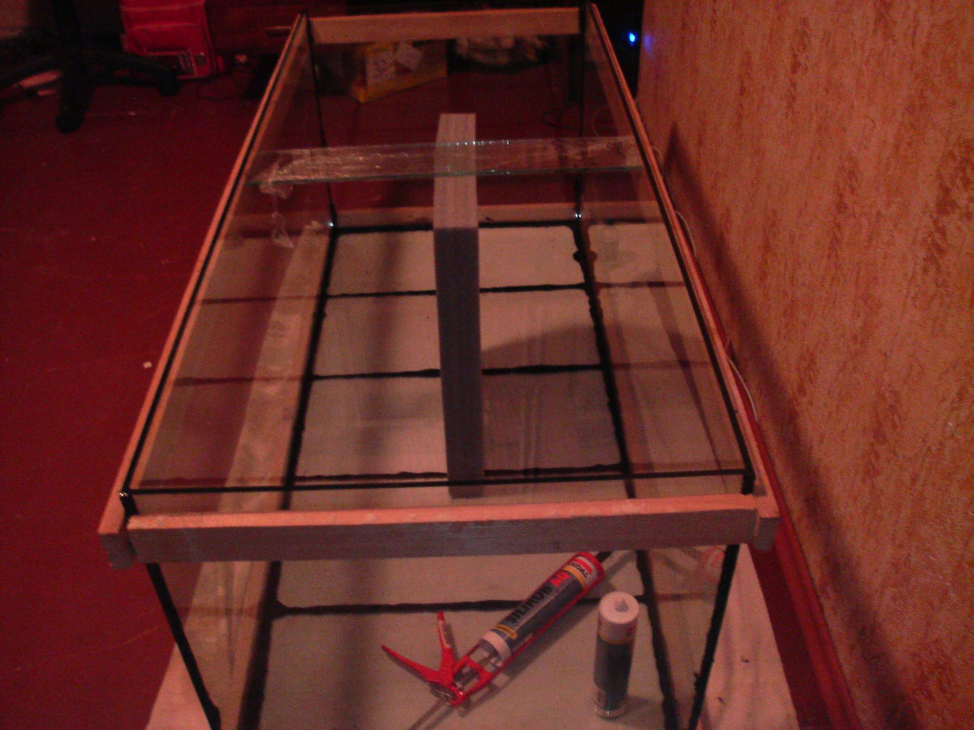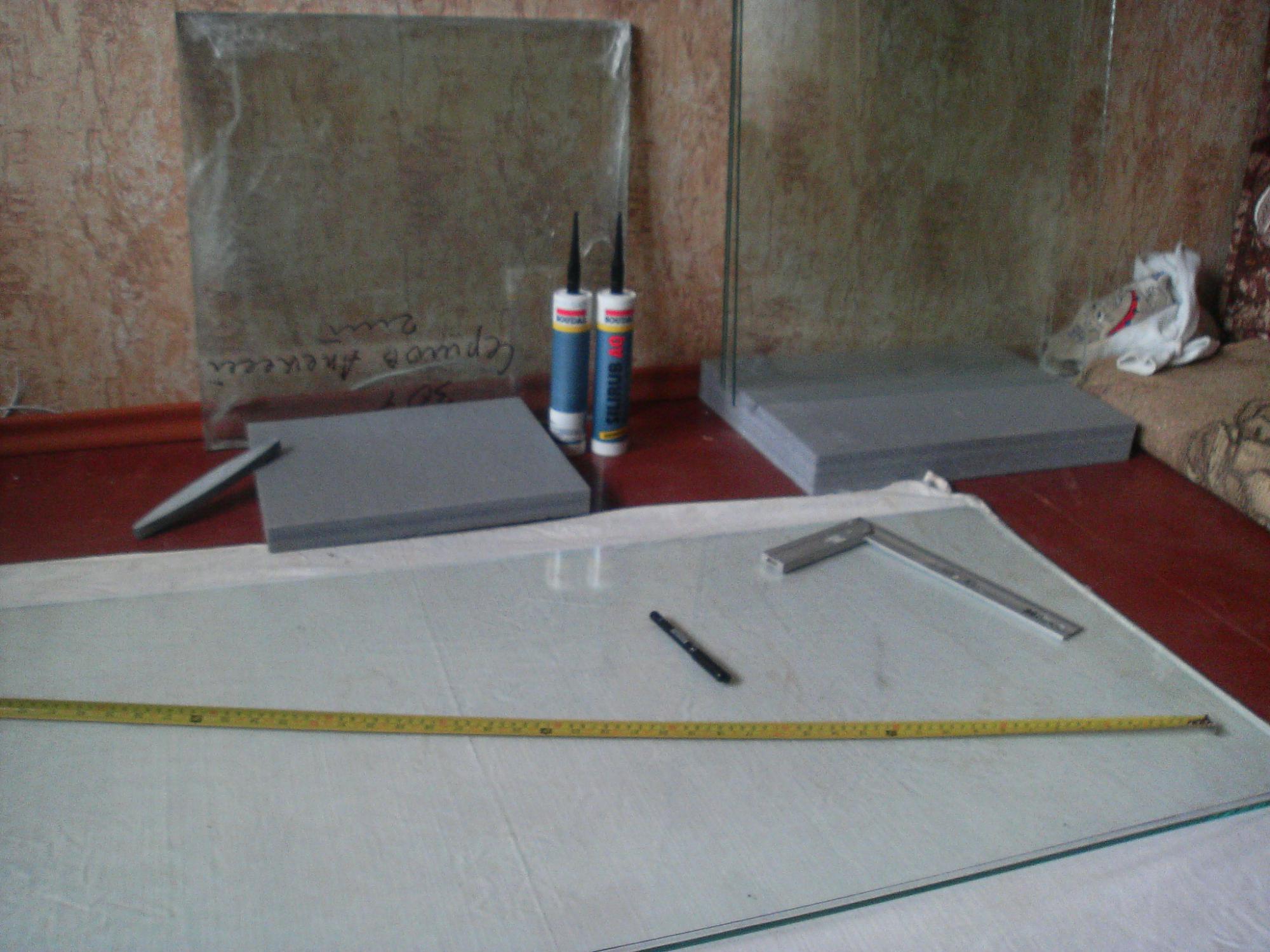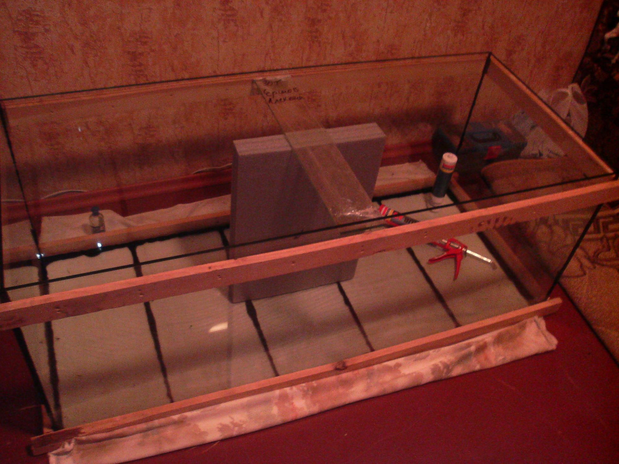 На основное дно вклеил второе. После чего по технологии вклеил лицевое боковые и заднее стёкла. И обжал их рейкой.