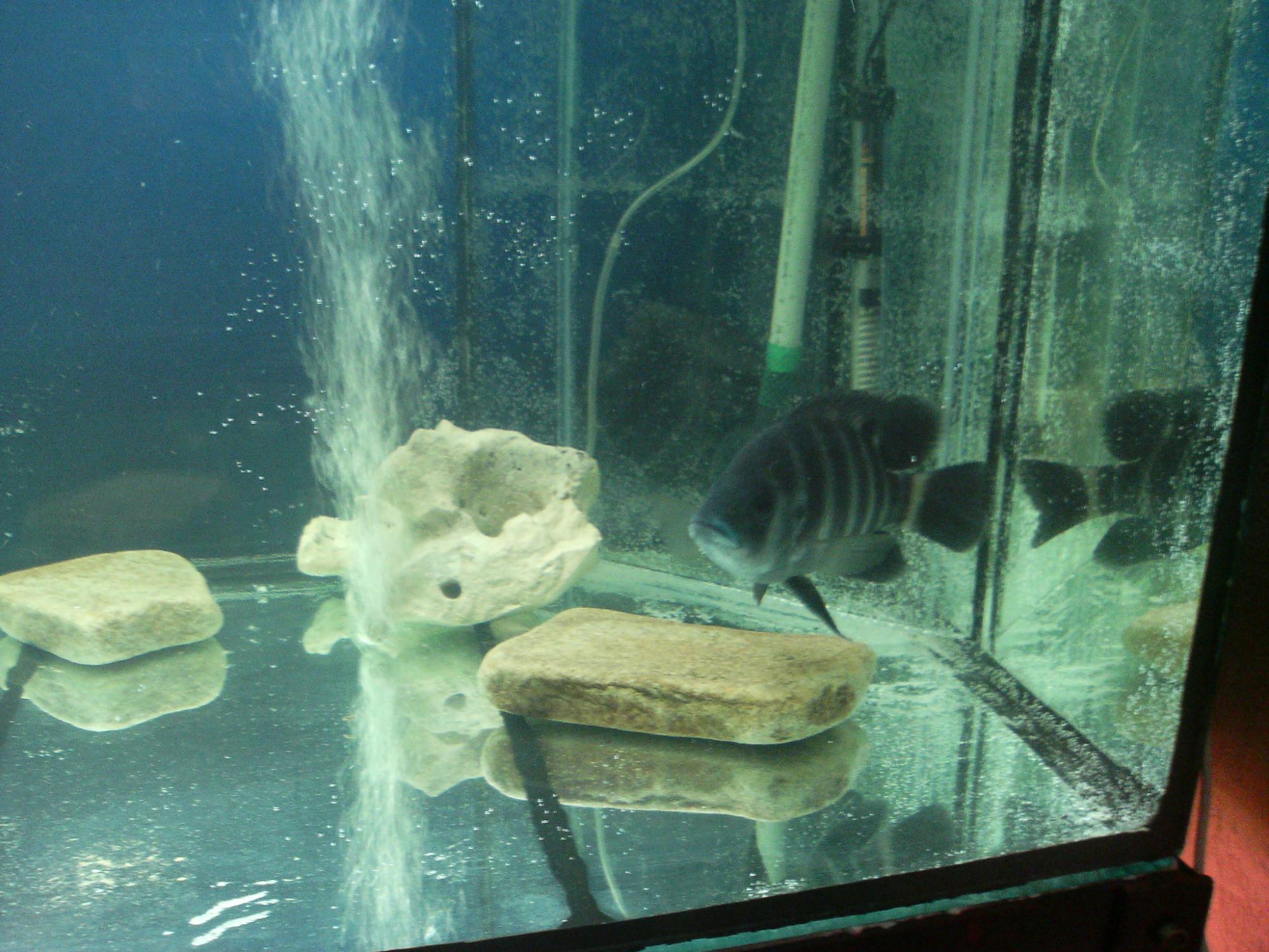 Дал отстой 24 часа, - воду слил и залил новой водой из крана, после чего посадил первого жильца или испытателя - самца тиляпии Бутикофери. После суточного наблюдения за Бутикофером, он был извлечён из аквариума, и в банку был добавлен грунт (базальт), декорации в виде плоских камней и посажены восемь подростков астронотуса.