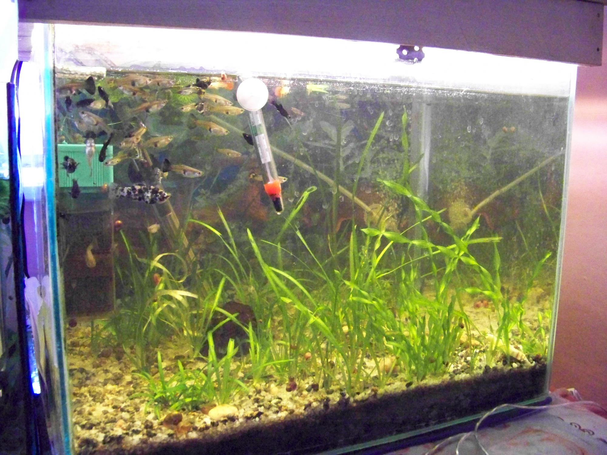 2-ий - населення: молінезія (1 самка + 2 вилочні самці), веліфера сніжинка (самець + самка), меченосці (1самка + 3 самці (1 молодий)), 2 даніо, гурамі мармуровий, гуппі (є Едлера), сімя тернецій (не продається), грунт - річкова галька