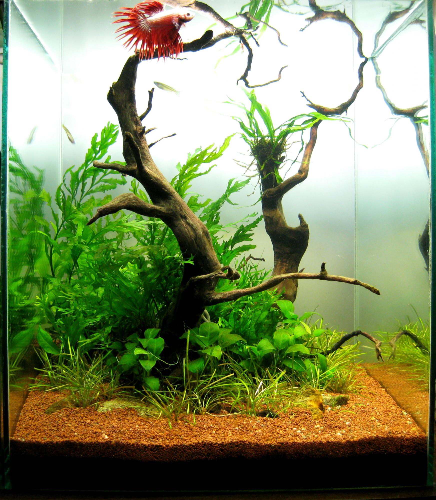 У многих ,думаю,(у меня так точно  )были мысли сделать аквариум с петушками более эстетичным и стильным,Вам это удалось очень достойно воплотить в реальности - сочетание коряги и короны просто класс  !!!