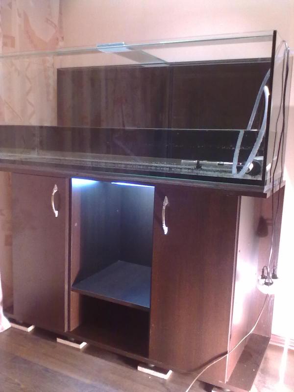 Класная длина аквариума под т8 лампу у самого такая. А аквариум под заказ .Я тоже тумбу сам делал ,а крышу сращивал из двух листов и кромковал пвх