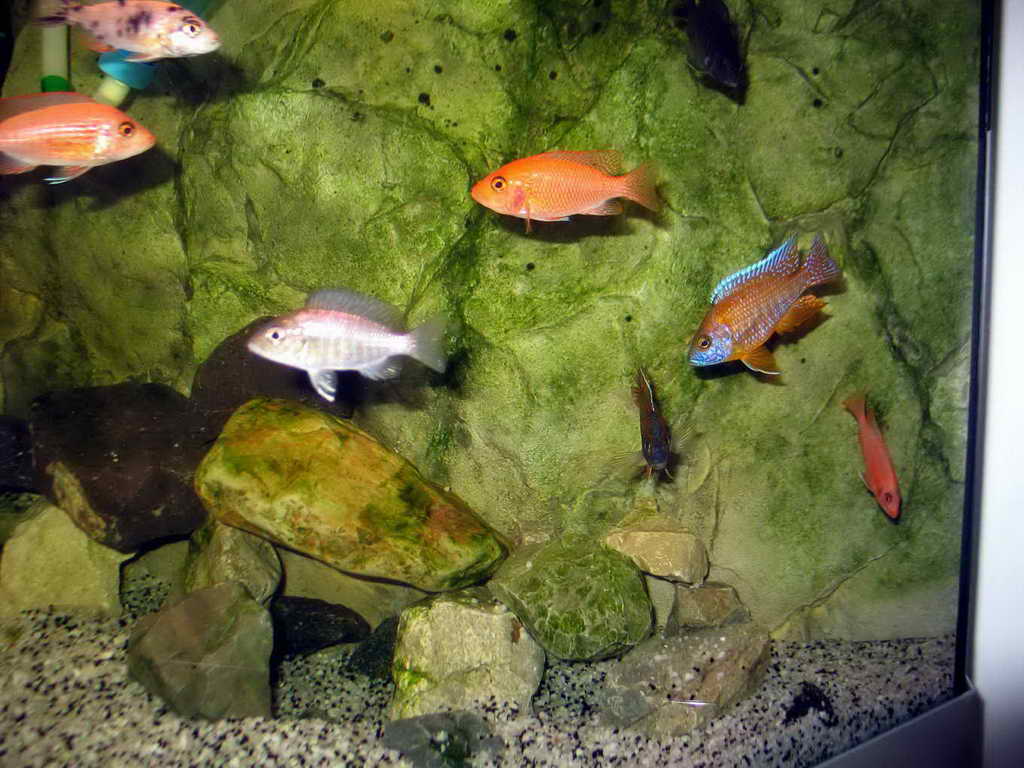 склеил короб из листового полистирола высотой раза в два выше предполагаемой толщины фона (примерно25-30 см, материал для короба может быть любой, просто под рукой был полистирол) и внутренними размерами задней стенки. установил короб на ровную поверхность (можно картон) и из фактурных кусков известняка выложил внутри фрагмент скалы. известняк укладывал как можно плотнее, минимальные щели и зазоры заклеил пластилином (был под рукой).сделано это для недопущения протечек жидкой алебастровой массы. Дизайн фрагмента, а именно выступы и впадины, зависел от моей фантазии и необходимости спрятать за фон уже в самой банке все шланги и прочую неестественно выглядевшую аквариумную технику. итак, получив макет фона одной задней стенки и нанеся на него кисточкой жировую смазку (обычное подсолнечное масло, было под рукой) залил его сверху затвердевающим алебастром. при окончательном схватывании алебастра получил готовую форму полностью повторяющую рельеф и фактуру фрагмента скалы моего эксклюзивного дизайна. следующим шагом было приготовление по прилагаемой инструкции пластмассы и заливка ( формование, кто как захочет) в установленную в короб форму из алебастра (форма была также смазана жиром). при больших перепадах рельефа фона заливка невозможна, только формование. для более быстрого отверждения пластмассы можно использовать промышленный фен. при реакции пластмасса вспенивается сама. для изготовления фона второй стенки все шаги были повторены с учетом того, что при стыковке обоих фонов в углу на одном из фонов требуется ровная поверхность (это особенность касается только угловых банок). потом края обоих частей были подогнаны с помощи ножовки и грубого напильника под размеры банки. покраска фона была сделана автомобильными красками в баллончиках (выбирал краски без тяжелых металлов). цветовая гамма на любителя и в соответствии с предполагаемыми красками рыбьего поголовья, есть, где разгуляться фантазии! :-) при установке в банку распилил обе части фона на половинки, а внутри склеил и вручную закрасил стыки губкой. две недели выстаивал фон в банке в воде для удаления запахов и выделений, воду менял. вот вроде и все. конечно, много мелочей упустил, но умные головы и умелые руки для чего?! результат был достигнут, оригинальный фон по весьма умеренной цене – на круг всех расходов набралось около двух с половиной тысяч рублей, раза в четыре пять подобного фабричного буржуйского фона дешевле.