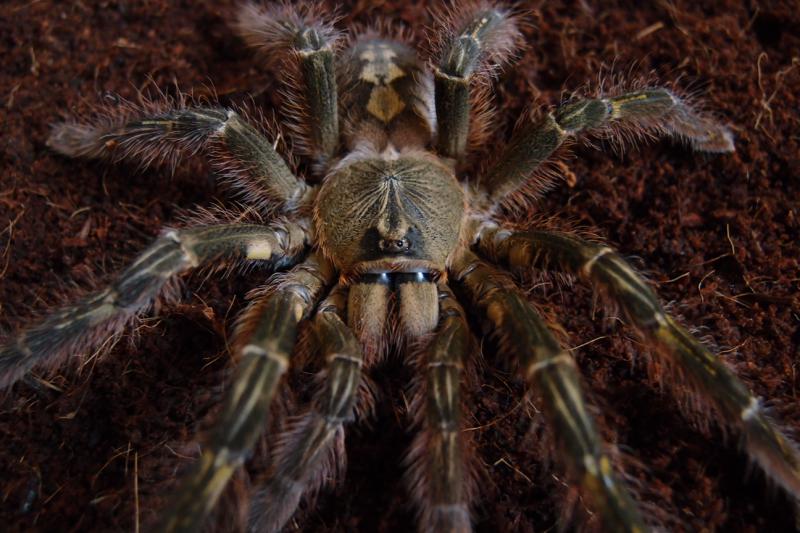 Poecilotheria striata FM. Съёмку проводил где-то полчаса,но так и не смог передать сиреневого отлива на карапаксе. Лампа накала дала немного желтизны.