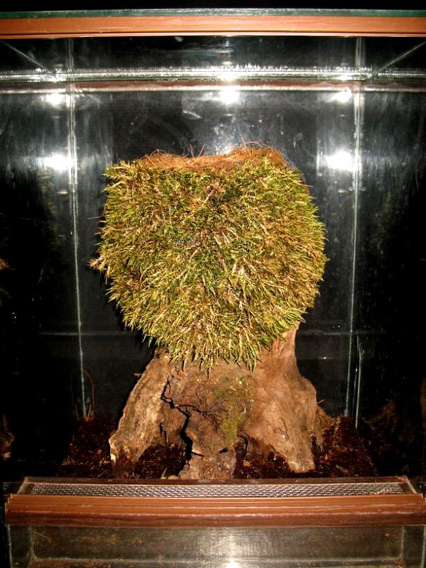 Тогда выглядело покрасивей крона дерева...зелёная, ровненькая и пушистая. Длилась красота до подготовки к линьке...злюка повыдёргивала половину мха и вплела вместе с грунтом для маскировки в паутинное убежище. Сама крона дерева сделана из нерж. сетки с ячейкой 2мм и через сетку за пару часов напросовывал мох, хотел что бы мадам сделала себе гнездо именно в кроне, там и вентиляция хорошая и место достаточно, но как я её не пытался там освоить с наступлением ночи всё равно вылазила и плела у грунта себе берлогу. Тут уже против природных инстинктов не попрёшь, вернее предоставь я ей правильный тип укрытия, заняла бы его, но думал что смогу заставить как своих авиков, несколько раз поломав начатое строительство, обустраиваться где я захочу. С пасалмами у меня такое не прокатывает, и картина что с кэмбриджем что с пульхерами (двумя), одинаковая, где придумали себе окопаться там и будут.