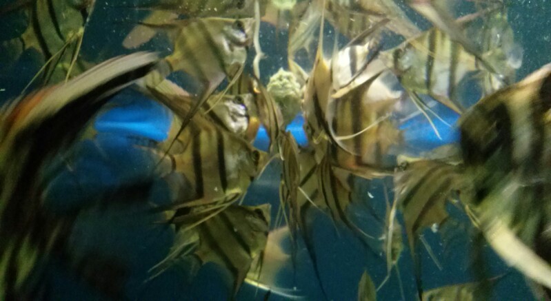 Когда-то разводил вот такую скалярию , кои, мраморная. Тренировался. Кормил хлопьями тетра и другими сухарями, особо не заморачиваясь. Воду менял два раза в неделю. И все было Хорошо!