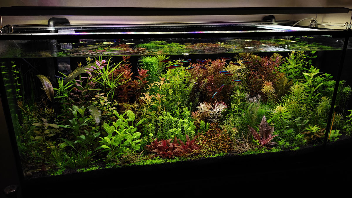 Освітлення та обладнання: Resun DTL LED 60 см; внутрішній фільтр Aquael Turbo Filter 500 (підключена флейта AQUAEL); обігрівач Aquael Platinum 75 Вт; світовий день 12 годин; температура води +25°C.