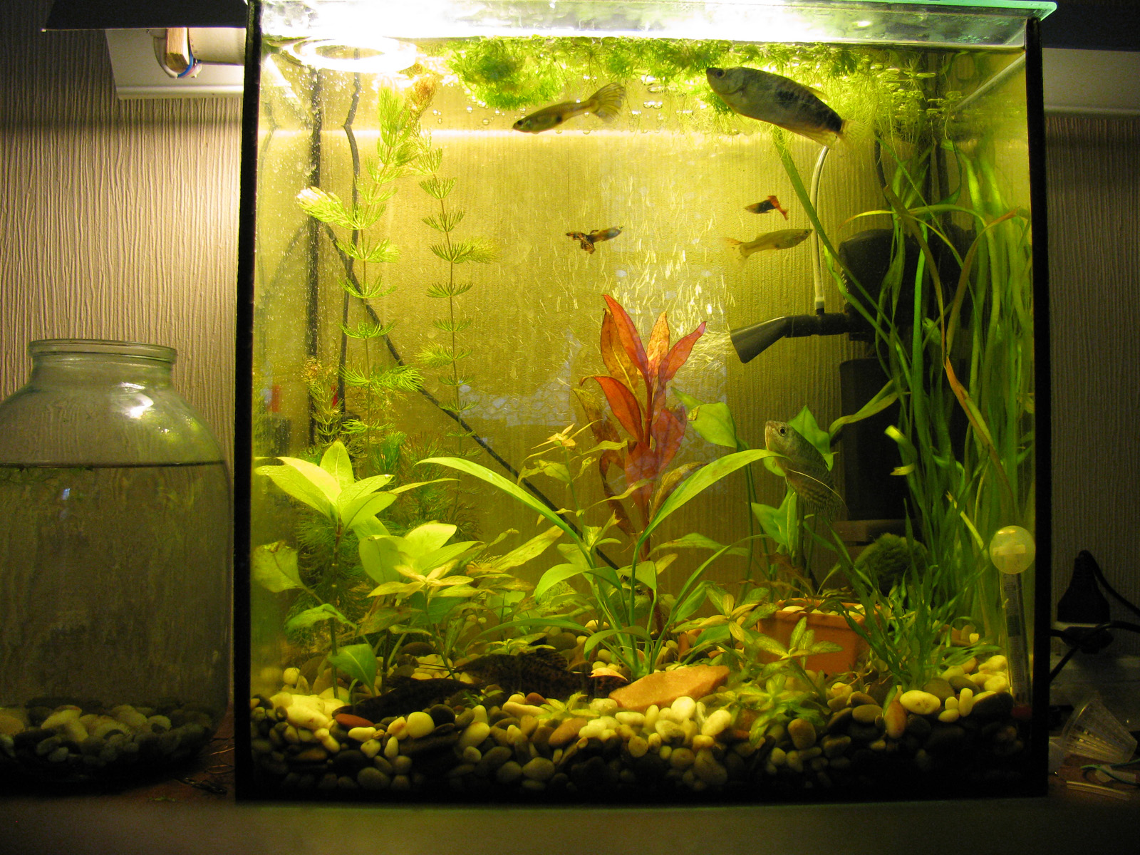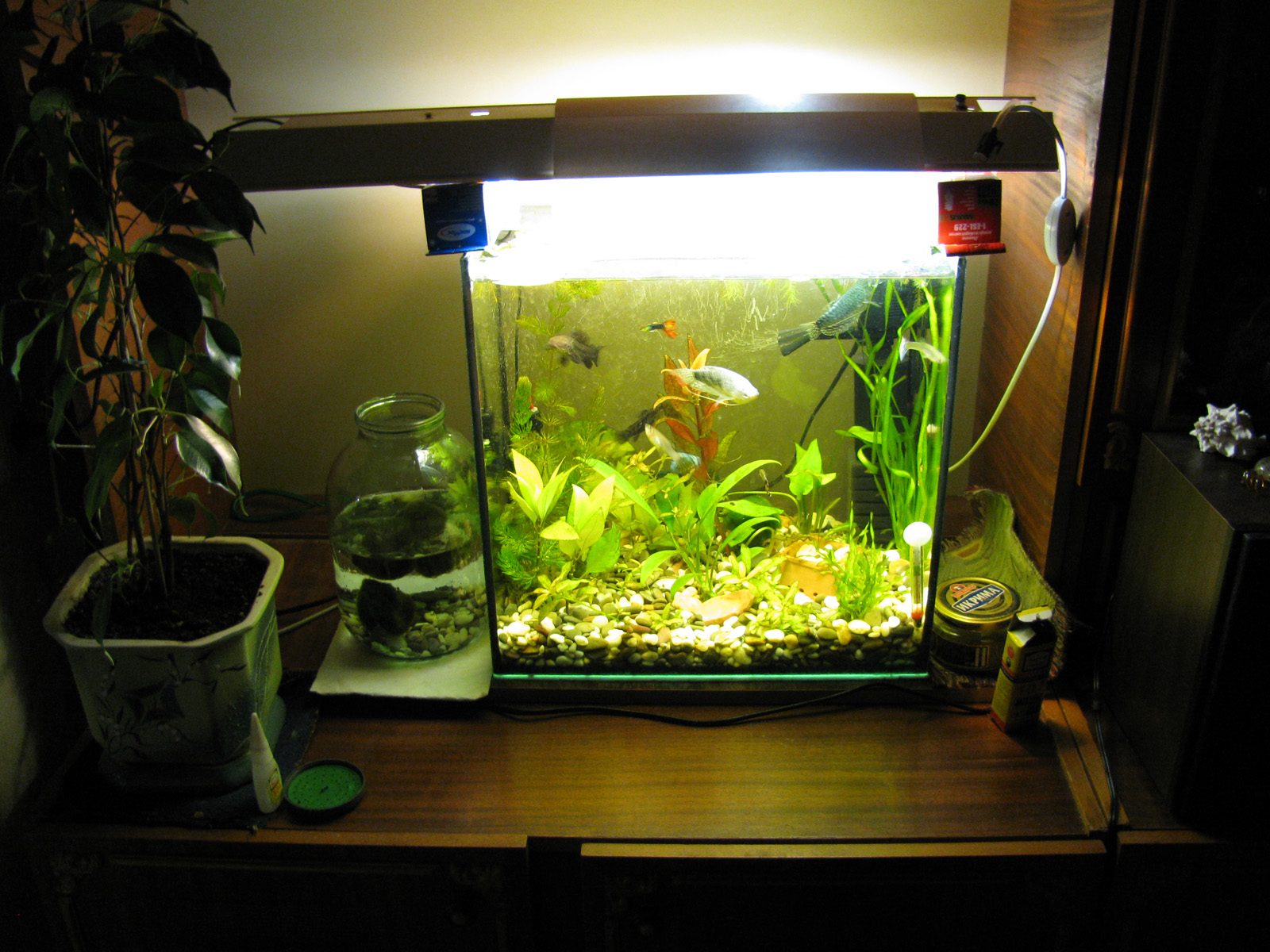 Аквариум 35л, установил экономки 2700К, 20Вт+ 13Вт. нагреватель и фильтр.