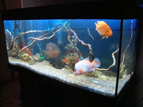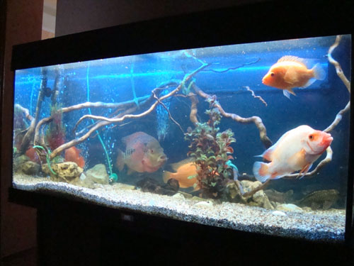 Итак, что мы имеем? Как я вижу аквариум: тёмный грунт, тёмный фон (можно чисто чёрный), несколько крупных камней на дне и небольшая каряга, на которой пара-тройка анубов (а можно и без них)+хорошие лампы, тоесть во всём тёмном плавает дерущий глаз фловер-хорн или цитрон и сразу бросается в глаза