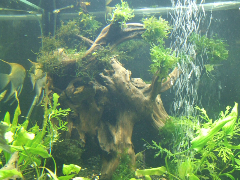 2) Примотка мха на пень. Ужас… у меня акантафальмус запутался в леске как то и умер. После чего собственно и не решался мох выращивать. Прочитал что можно, хехе внимание! Мох приклевать клеем на основе циркония! Тот что продается в любом маркете на кассе. Так и сделал. Точечно наносим клей на коряжку и сверху приклеиваем мох. Клей при соприкосновении с водой вступает в реакцию мгновенно. Мох держится вторую неделею. Рыба не дохнет. Хотя анцитрусы прикололись и на третий день одну коряжку почистили от моих приклеиваний. Минусы приклейки.1) Страшно  2) Если мох таки отрывается или его отрывают рыбы, на коряжке остается белый кристаллический след. Ну и берегите руки при приклейке. Лучше клеить аккуратно пинцетом. И если клей капнет в воду то он легче воды и плавает на поверхности. Напомню он нагревается в соприкосновении с водой. Вобщем вот такой у меня пень теперь.