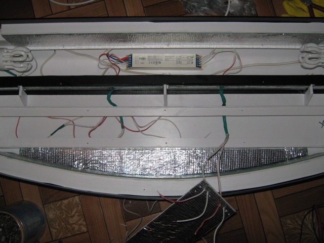Да будет свет ! Работа над крышкой для аквариума закончена. Единственное что пересмотрел от первоначального, - в место одной энергосберегающей 20w/ 1200lm / 2700K - установил две энергосберегающих 15w / 900lm / 2700K - по моему, немного больше света, но зато фланги аквариума будут лучше и ровнее освещены , в общем 0,8 Вт/1л.или (33,0 lm/l.+ 1лампа Gro lux F25W/30 т8 - силу светового потока для этой лампы почемуто указывают  )....