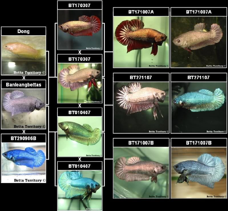 Пример 2. В этом примере автор объясняет, как он получил собственную линию красных HM PK. В 2007 был приобретён красный самец HM (Siamimbellis, Таиланд), посаженный на нерест с самкой традиционного PK (Daniella Vereeken, Бельгия). У F1 (BT060507) был хороший окрас, а форма – среднее между вуалевой и дельтой. В возрасте 2.5 месяцев молодые рыбки отнерестились прямо в выростном аквариуме. Получившееся поколение F2 (BTXX0707) дало некоторое количество самцов PK с очень длинными анальными плавниками, но при хороших спинных и хвостовых плавниках. Один из этих самцов был посажен с сестрой для получения F3 (BT030408). Этот же самец нерестился с самкой PK от пары красных HM PK (Satornbetta, Таиланд) – так появилась ещё одна, родственная, линия (BT100208).