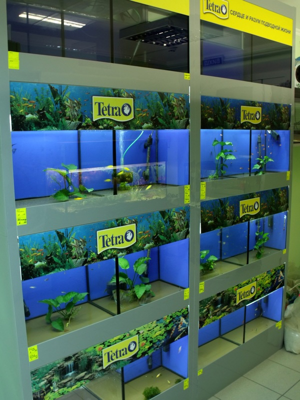Ассорттимент, в принципе, стандартный для аквамагазина. Есть все для первого времени. Остальное - под заказ. Аквариумов как таковых не много, все - "Природа", самоклея не увидел.