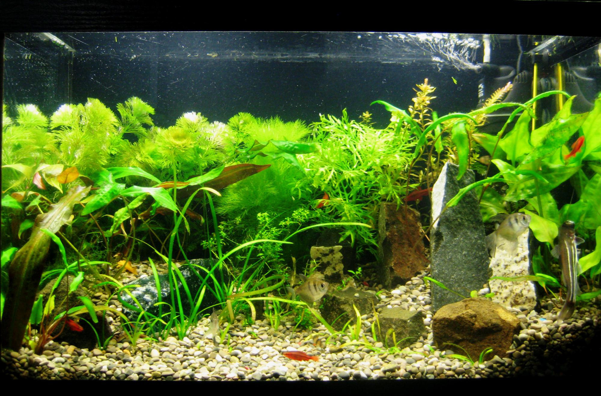 Теперь руки добрались и до аквы. Мои 50л. Вчера был перезапуск после 5-ти летнего простоя. В нём только поддерживалась жизнь рыбам, растючка вся погибла как и большинство рыб, остались только 4 рыбки.
