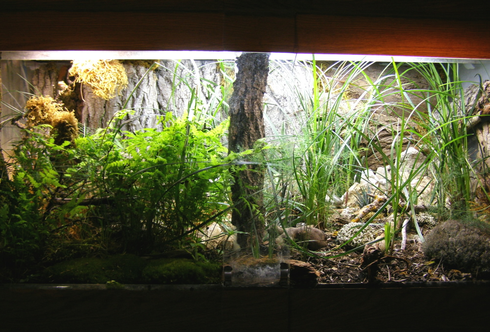 Терраиум для ужа позже сфоткаю, а в этом террариуме медянка живет с квакшами, жерлянкой и озерной лягушкой, но можно и водяного ужа поседить, только соотношение воды и суши в пользу воды лучше сделать, лягушек по идее тоже можно пускать- водяной уж обычно их не ест.