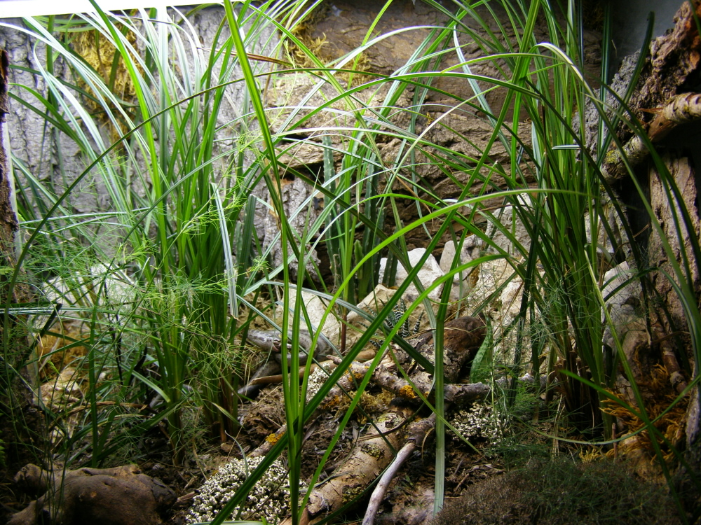 Да водяные ужи вроде не такие уж, чтобы растение срубывать при ползании в террариуме, можно высаживать дерновинные корневищные вечнозеленые злаки, какие часто встречаются возле воды, низкорослую осоку, стапелию, все эти ратсения постепенно разрастаются сами по себе, вот они, а так же папоротник и еще очитки, монетницы всякие растут у меня в террариумах. Вообще террариум где растения у меня не совсем "обычный", такое наверное нет необходимости делать, но если найти дерновинный злак и посадить в песок в который добавить земли- то расти должен! Кстати песок разве не налипает, лучше тогда глинистый или с землей, а то уж рыбу с песком наверное будет постоянно есть.