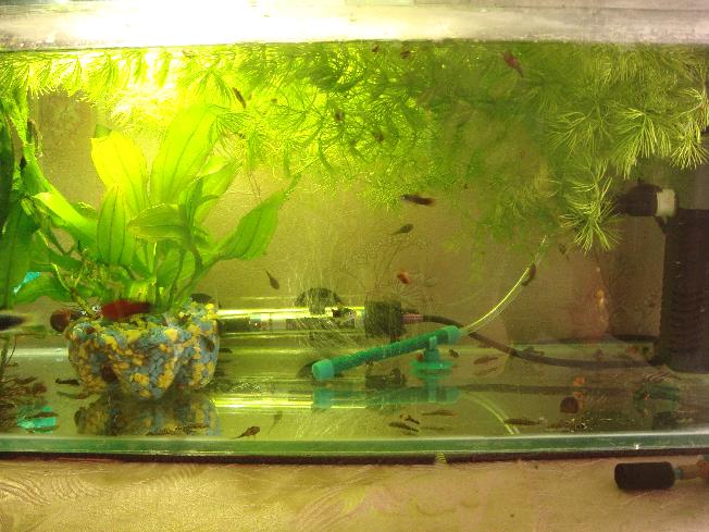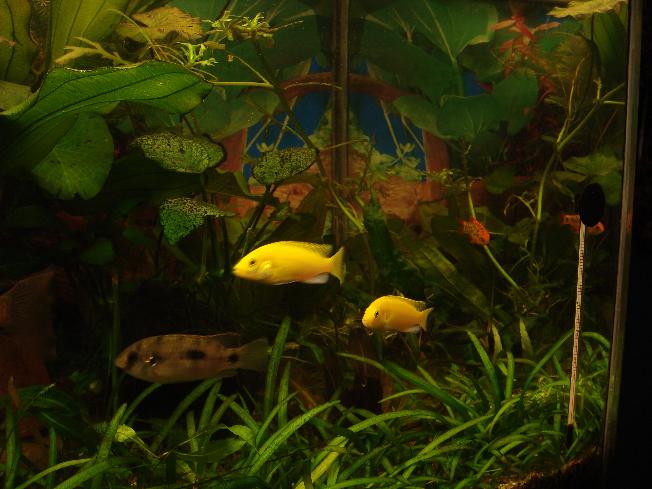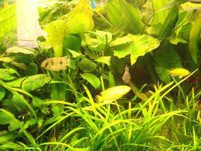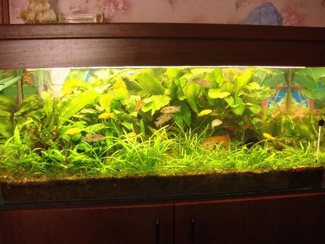Всем привет!Что-то смотрю,практически вся деятельность в клубе притихла.....Лето?а я вот решил выложить несколько фото моей баночки....изменений особо нет.только вот не удержался-добавил 4 штучки лабидохромисов еллоу,уж очень они яркие....пока ни с кем не дерутся и травку вроде не трогают...И еще несколько фоток моей малышни,правда там карликов нет....что-то пока размножение не получается к превеликому сожалению.....