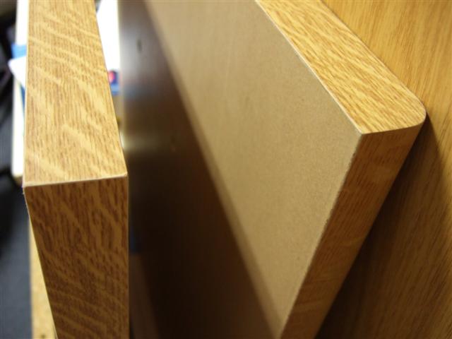 Далее буду описывать порядок сборки. Для начала верхняя и нижняя плиты. Они покрыты пленкой только сверху и немного снизу. БОльшая часть нижней поверхости - бумага, поэтому как торцы так и поверхность с бумагой надо обработать лаком. Перед лакировкой небольшим куском наждачки зачищаем острые кромки плит от небольших остатков распиловки (опилок, и неровностей бумаги). Лак оставляю на завтра. На сегодня этим закончу.