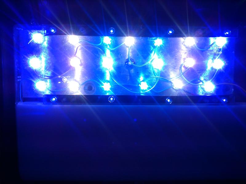 Добрый день.Случилась непредвиденное изменение штатного света на лед(перегорела синяя лампа).Разобрал старый светильник,демонтировал диоды,на работе сваял из куска аллюминия радиатор,выкинул начинку из крышки,вообщем свободным вечерком на( коленках) все это впихнул в крышку.Результатом доволен не очень  ,но пока будет так.