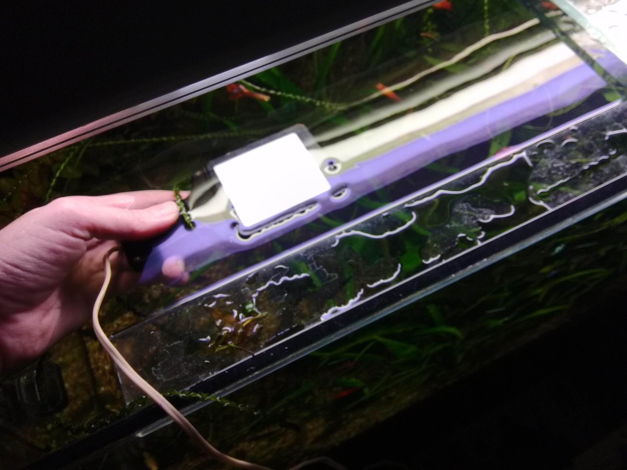 Батёк, еще раз перечитала формулировку просьбы и нет, я так вам померять не смогу, потому что сразу будет темнее, светильник находится строго над аквариумом и напрягать другого человека чтоб подержали снятый с аквариума светильник я не вижу смысла, ведь мы светим в воду.