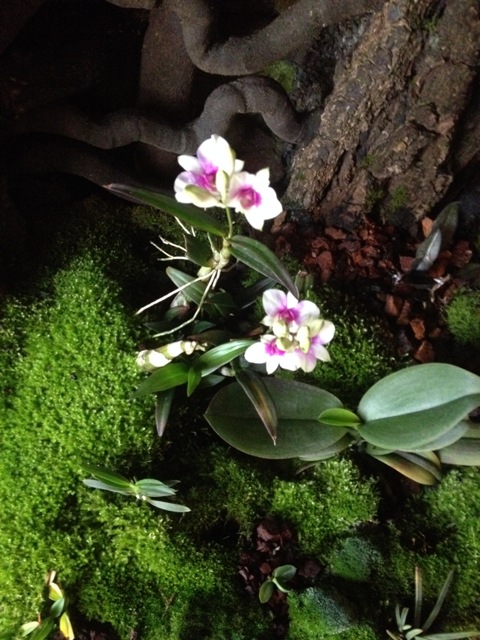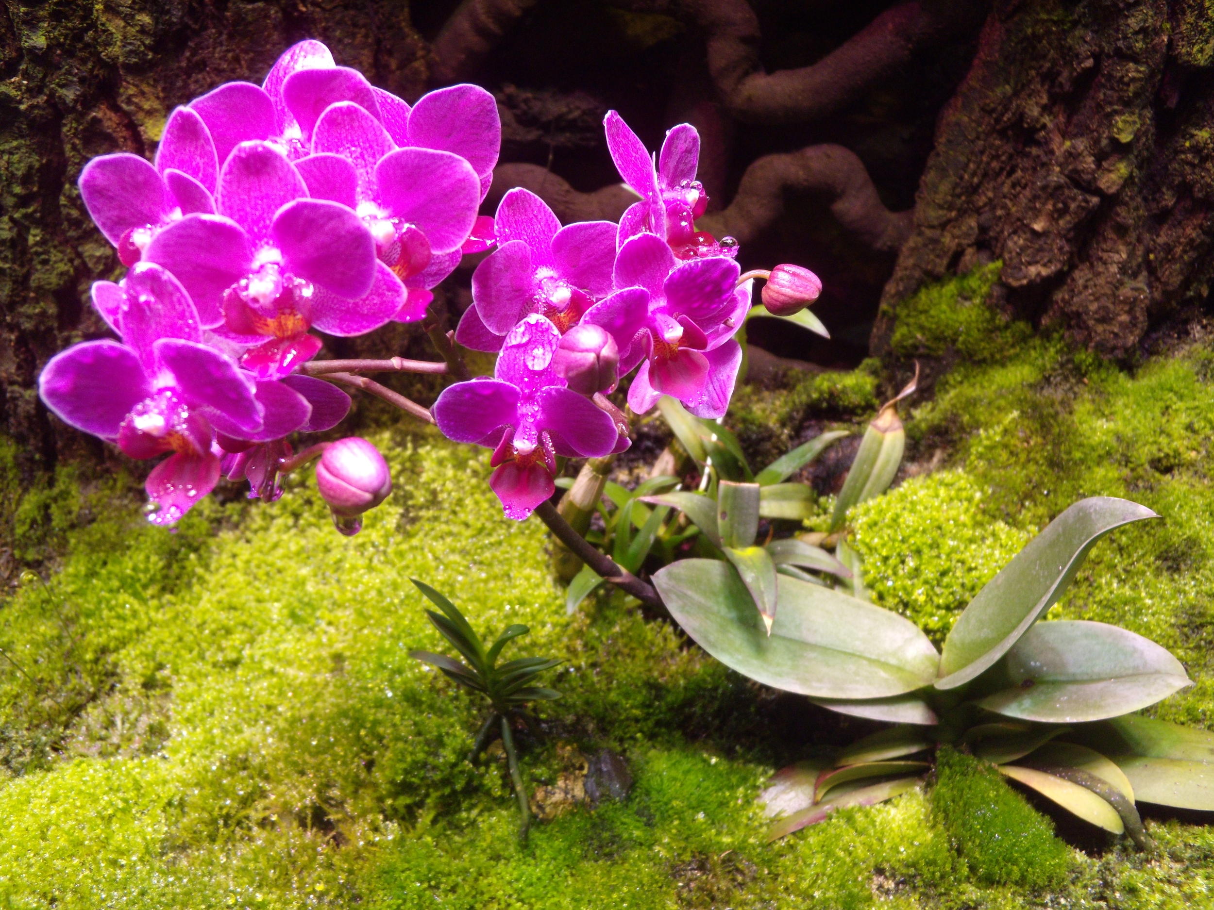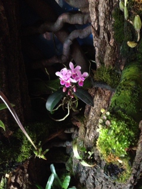 Мини фаленопсис . Житель ещё старого террариума . Первый мой эпифит. Ему уже лет 5. Ни разу до того не цвел нормально , так как живя на кокосе постоянно терял корни и цветоносы от гнили . Сейчас выдает все ферменты , что накопил за эти годы.
