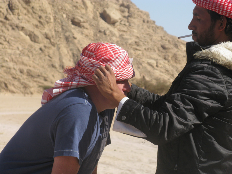 Имшан, как он сказал, "старший гид", попал с нами на комбинированную экскурсию "на джипе по Синайскому полуострову - чаепитие у бедуинов - на верблюдах - обед (обычный, но тоже у бедуинов) - на джипе в Дахаб - заплыв по рифу - Дахаб: закупка сувениров" случайно. Гид, который должен был с нами ехать, поздно вечером вернулся с экскурсии в Иерусалим и пропал. Как выяснилось впоследствии, очевидно, так устал, что его не могли разбудить ни будильник, ни телефонные звонки. Выезд задержался на минут 40 (это и был единственный прокол сотрудников турфирмы), но уже через пол-часа поездки с Имшаном и Идрисом (водителем) никто об этом недоразумении не помнил вообще.