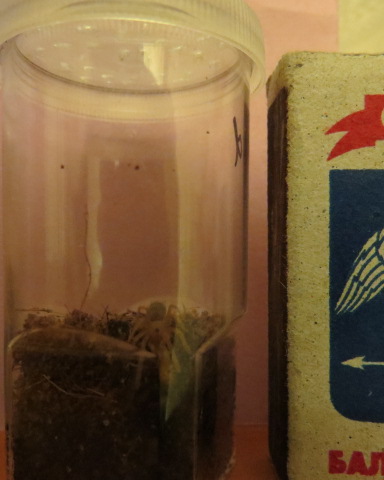 А вот Nhandu chromatus Л2  за трапезой. Паук уже второй линьки, а такой крошечный... Для сравнения рядом коробка от спичек.