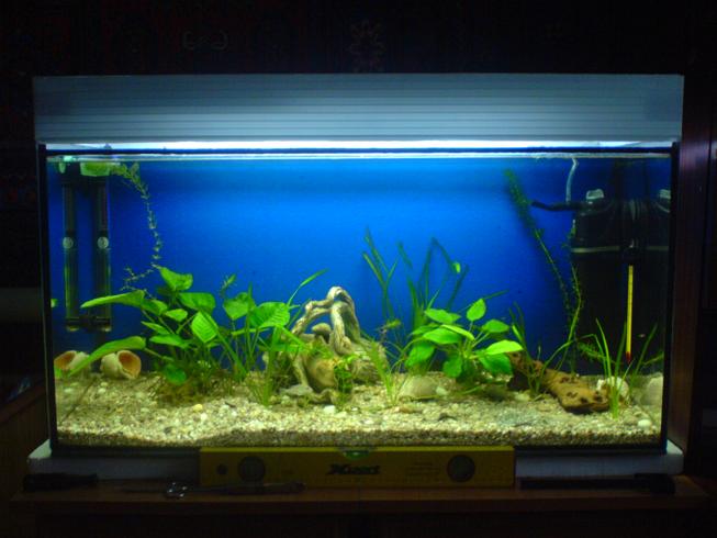 Из растений - пара анубиасов + несколько длинных из грунта быстрорастущих с короткими листиками узкими листиками по всему стеблю + несколько с длинными узкими листьями, произростающими прямо от уровня грунта. названий не уточнял...