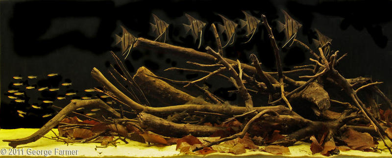 Крупные коряги, на них папортники, стайку Альтумов (5-7 шт), листья катапанга на дне разбросаны, песок речной, немного камней.
