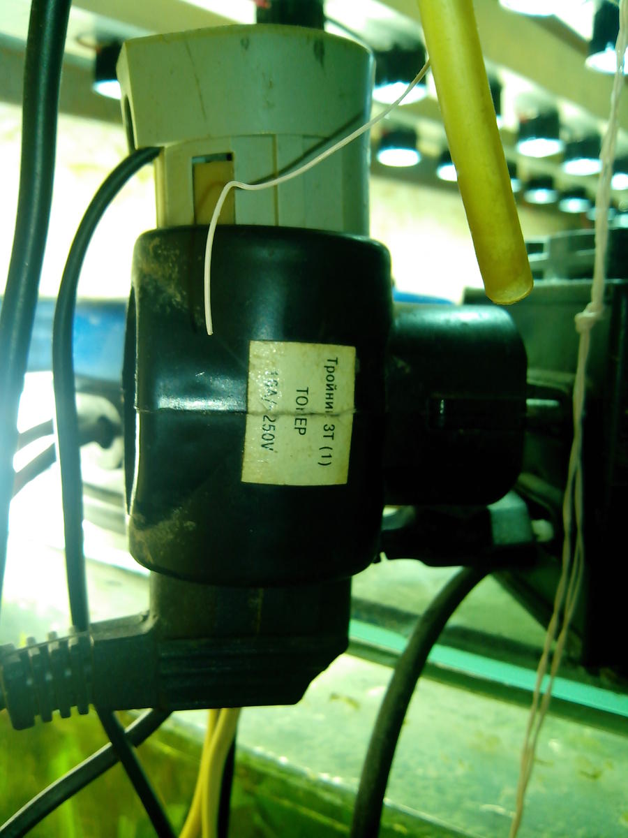 На второй фотографии просто тройник в который воткнуты вилки для питания светильников. Не на всех аквариумах у меня еще светодиодное освещение.