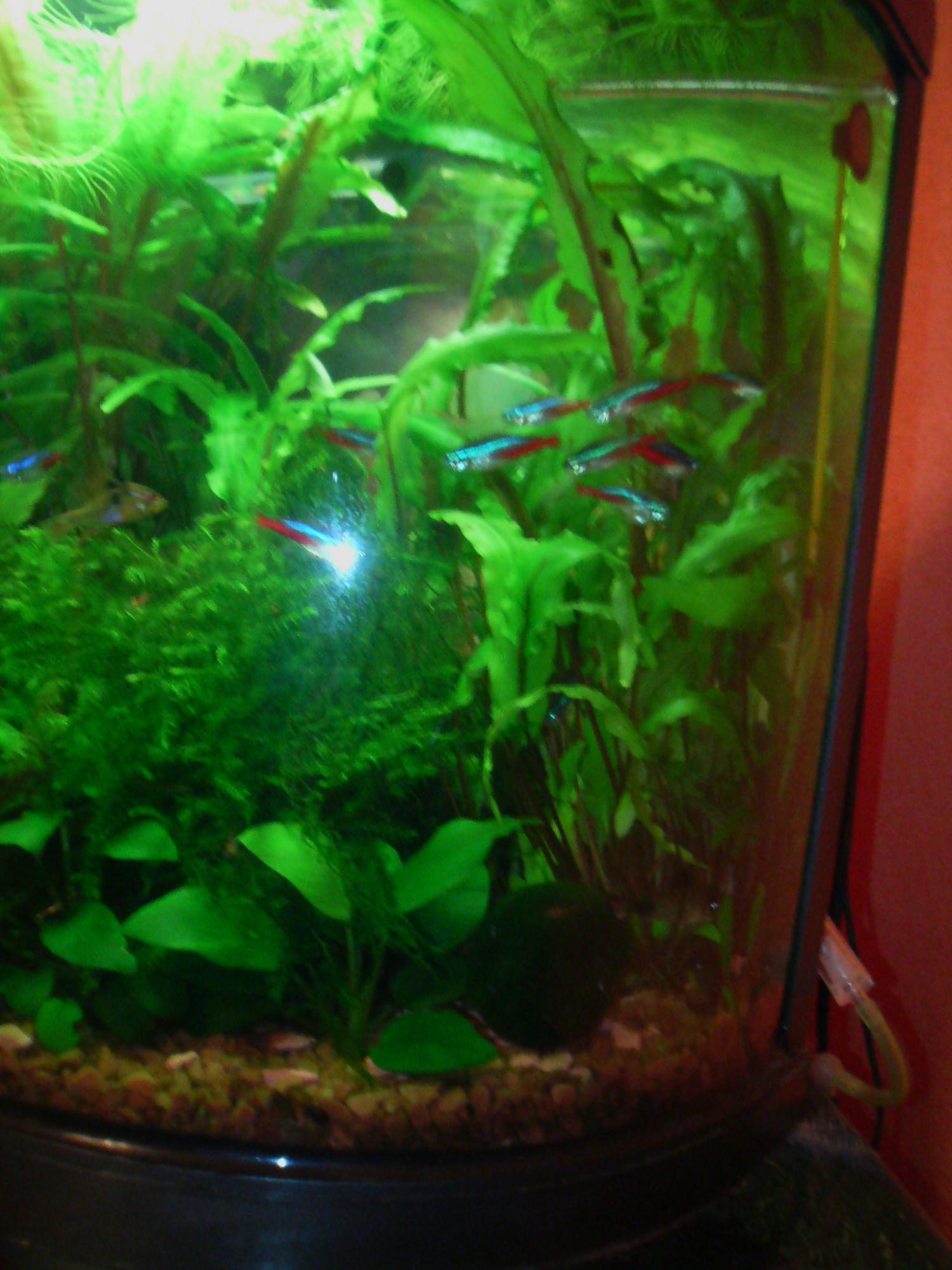 Добрый вечер. Вот решила выложить свеженькие фоточки моего маленького любимчика. Подселила стайку неончиков .Сейчас мы такие. Может уже пора чуть-чуть прополоть,но боюсь трогать этот зелёный уголок .