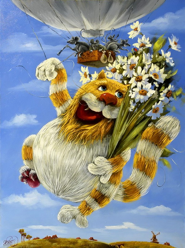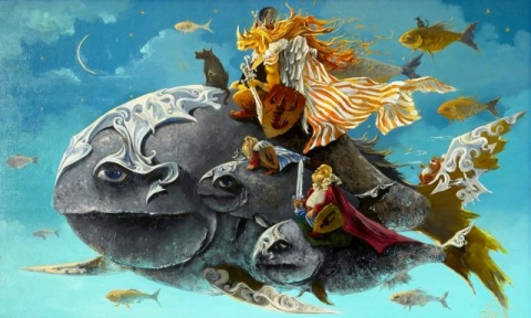 На картинах художника сказочные персонажи населяют маленькие игрушечные города, домики которых прилепились к ветвям большого дерева, летят по небу на спине гигантской рыбины или на палубе корабля-призрака. Фактура полотен скорее западноевропейская: архитектура домиков готическая, персонажи одеты в средневековые европейские костюмы. Это своеобразные вещи в себе: безмятежное существование жителей города, создан ного воображением художника, кажется, ничто не нарушает, люди и животные, очевидно, разговаривают на одном языке; безмятежно развалившись у входа в домик, его хозяин играет в карты со своим котом, летит на праздник носорог с бокалом шампанского, здесь великан мирно соседствует с лилипутами, а гигантский змей расположился на средневековом замке, обвив его башни своим чешуйчатым телом. Русалки и волшебники, рыбы и черепахи довершают мистические сюжеты. Изображая сказочную реальность, художник не пишет жанровые сцены, его персонажи статичны и, кажется, вечны: уклад жизни в этих волшебных домиках не меняется тысячелетиями, и в этом - своеобразная мудрость его жителей по сравнению с миром людей, населяющих реальную землю, ведущих постоянную борьбу за существование. В выстроенном сказочном мире художник нашел некую землю обетованную, которую отображает в серии полотен на эту тему.