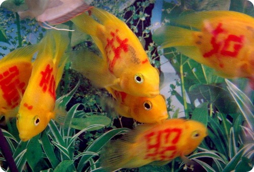 Новая мода на рыбок появилась в Китае. Теперь любители аквариумов стремятся раздобыть рыбку с татуировкой на боку. Наиболее востребованы татуировки в виде иероглифов, обозначающих счастье, богатство или успех. «Разрисованные» рыбки как правило в два раза дороже обычных.