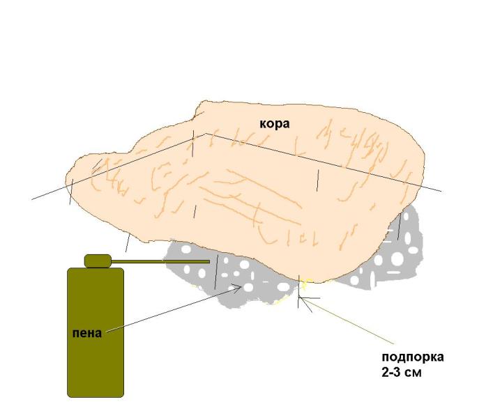 Далее нужно сделать так с корой ,чтоб корм не мог прятаться за ней .Или корм нужно иметь такой ,чтоб в линьке не кушал паука,или давать в таком виде ,чтоб был последний эффект.Тогда можно оставить всё без мороки за потайные ходы для тараканов.Но рекомендкется всёж устранить этот момент.Делаю я это в последнее время монтажной пеной. Поставил кору на опоры 2-3с м и в этот просвет надул монтажной пены. Поверхность того,на чем это всё делают должна быть смазана парафином (свеча), чтоб пена не залипла.Кора смачивается водой,чтоб наоборот, пена прилипла. Потом пена выпирает из под коры ,высыхает, обрезается по краям всё ножом и корм у нас теперь очень боится пинцета , так как между корой и задним (боковым) стеклом нет пространства.Всё садится к стеклу на силикон,а к оргстеклу на шуруп.