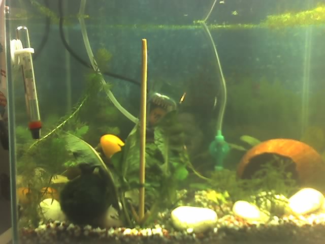 1. Аквариум запустила вчера. Воду правда залила из старого акваса+3 литра талой бутылированной. Он пока не полный, но лучше постепенно долью. Рыбасы ночевали в 3л банке в своей воде, но пребывали в состоянии такого жестокого стресса, что не были в состоянии оторваться ото дна. Помутнение на утро прошло, и я решила рискнуть - запустила их в аквариум, к родным раслюшкам и кокосу. Они моментально заныкались под фильтр и сидели там втроём до обеда, глядя на меня тремя парами полных ужаса глаз. Конечно же не завтракали...  (Рис.1 фото аквариума)