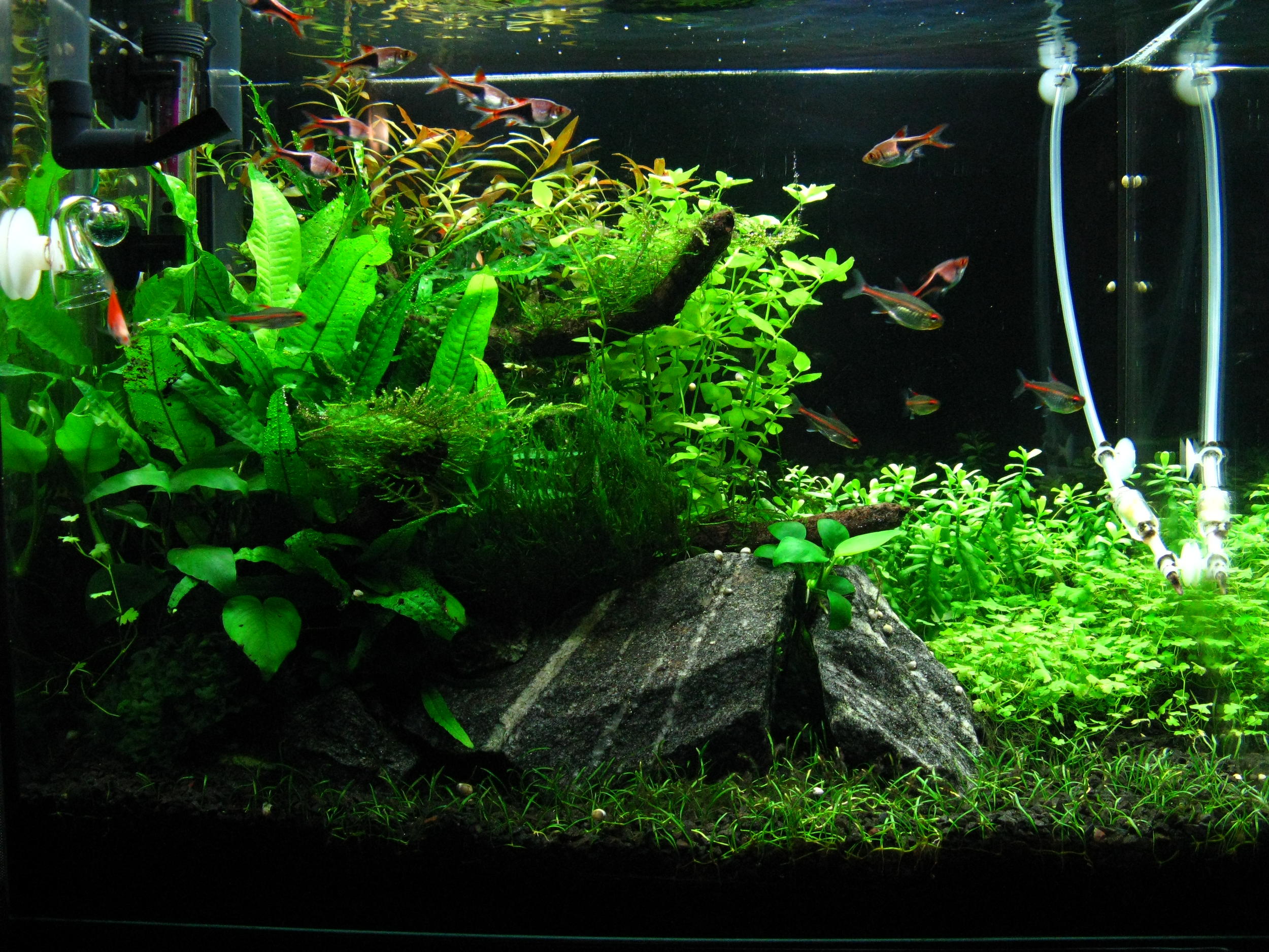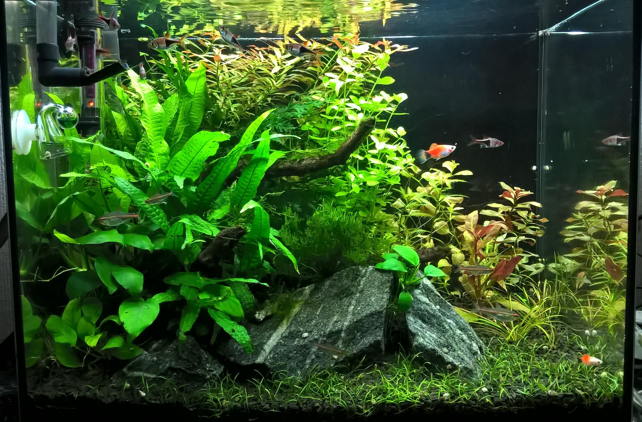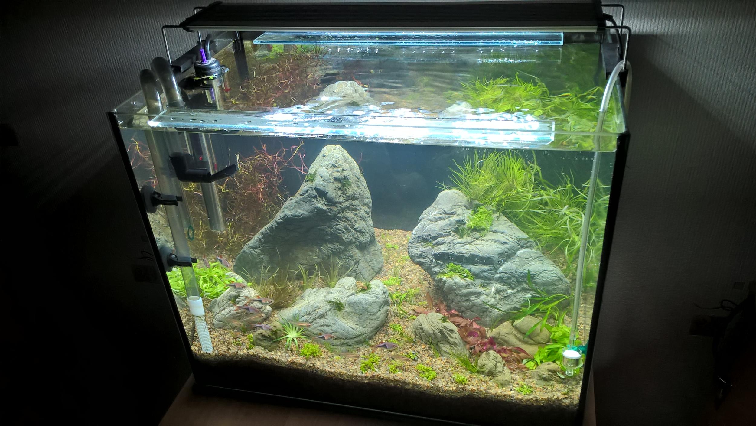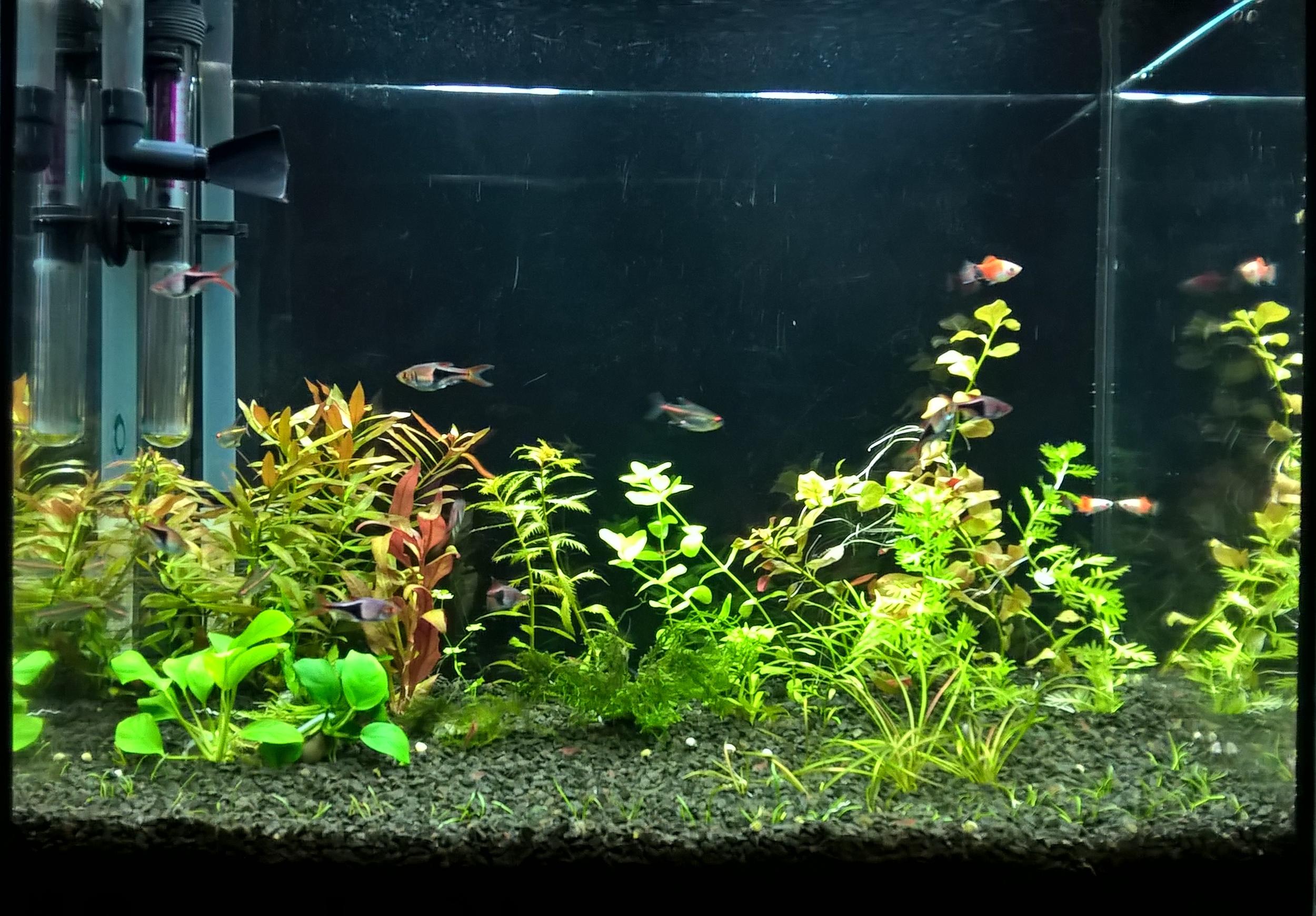 В общем получился небольшой перезапуск, с сохранением всех длинностебельных видов, живности и 50% старой воды.