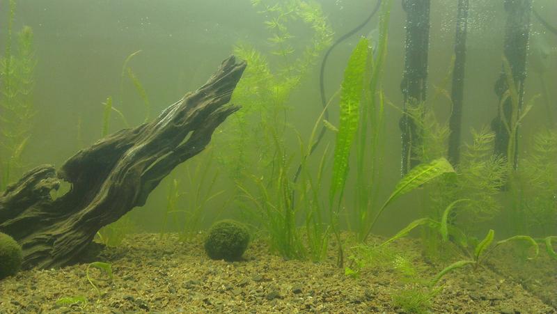 Ну вот растения потихоньку гибнут... ((( Пока держутся роголистник и людвигия... По совету просифонила грунт в своем действующему аквариуме и влила это все "сокровище" в новый... Посмотрим...Сегодня пришел обогреватель и коряжка. Жду фильтр. Из населения по прежнему молюски... Пока вот так вот.