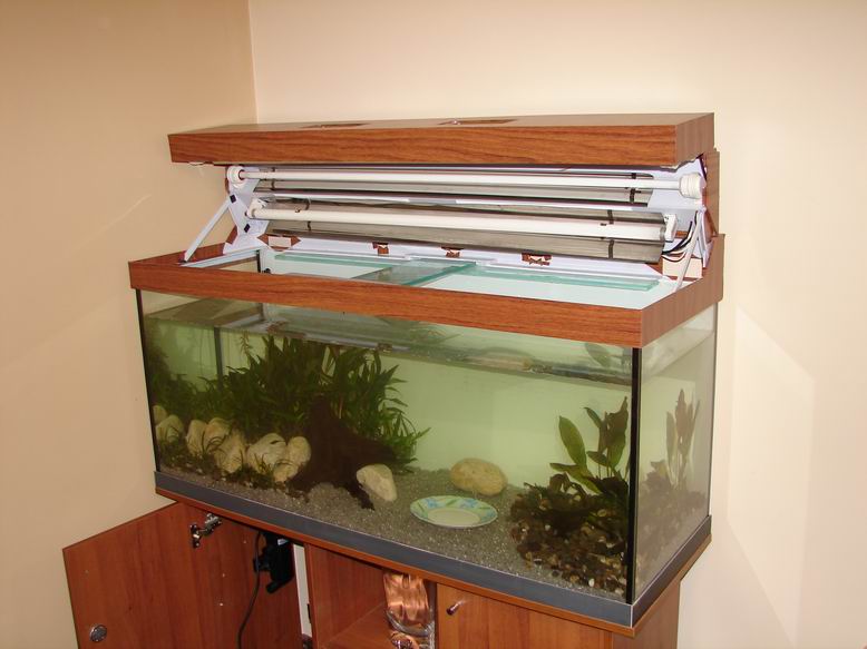 Банка 120х40х50 8мм, сделана акватикой. Тумба под нее, две закрытых (на замке) и открытая секция. Светильник-крышка самодельный, фото в атаче. 3х54Вт Т5 и 1х30Вт +светодиодная луна. Ласпы включаются раздельно 54+2х54+30Вт. Все лампы с отражателями, нержавейка, трапеция. Канистра Atman CF-1200, УФ стерилизатор 5Вт (лампа практически новая), термокабель Хайдор (в нагрузку могу дать атмановский обогреватель с термоконтролем) и компрессор одноканальный.