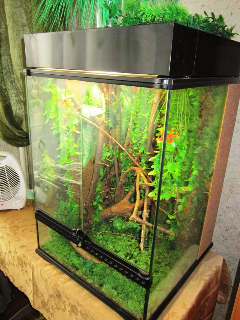 Террариум 45*45*60, внизу термоковрик. Задняя стенка и часть боковых обделаны коркой. Присутствуют коряги и искусственные растения, лампы.