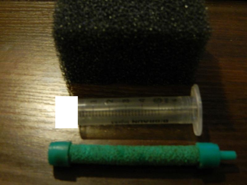 Сделал эрлифтный фильтр для банки с петушком. Сомневаюсь что работает, потому что во всех конструкциях трубка выходит из воды, а у меня под водой. Трубка - шприц с отверстиями, распылитель - зеленая обычная трубка. Вставляю распылитель в шприц а потом шприц в мочалку.  Нужна именно такая миниатюрная конструкция. Жду советов по улучшению.