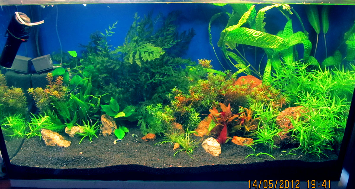 Так простоял аквариум в темноте больше месяца... и вот, выиграл аукцион с шапкой Didiplis diandra, пришлось в срочном порядке делать светильник и проточный генератор СО2 (будет желание, покажу и крышку и генератор в подробностях). Со2 булькает с 1,5 литровой бутылки с бражкой около 1-2 пузырька в сек.