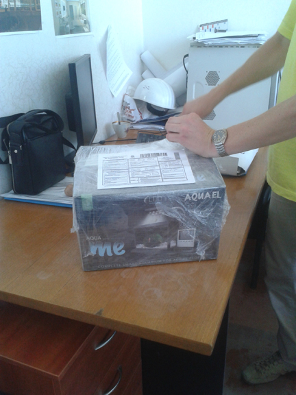 Утром поступил звонок от Наташунчика, сотрудницы Новой Почты, и она радостно сообщила мне, что аквариумы прибыли. Пришлось срочно коректировать рабочий день, оставлять рабочих самих и собравшись веселой компанией мы побежали на склад Новой Почты. Получили посылку, вернулись в офис.