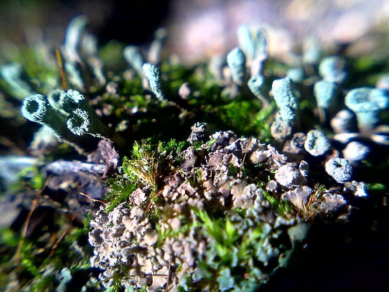 На фото помимо мхов присутствуют лишайники"голубовтые чешуйки и трубочки". Лишайники-растительная форма симбиоза между грибом и водорослью