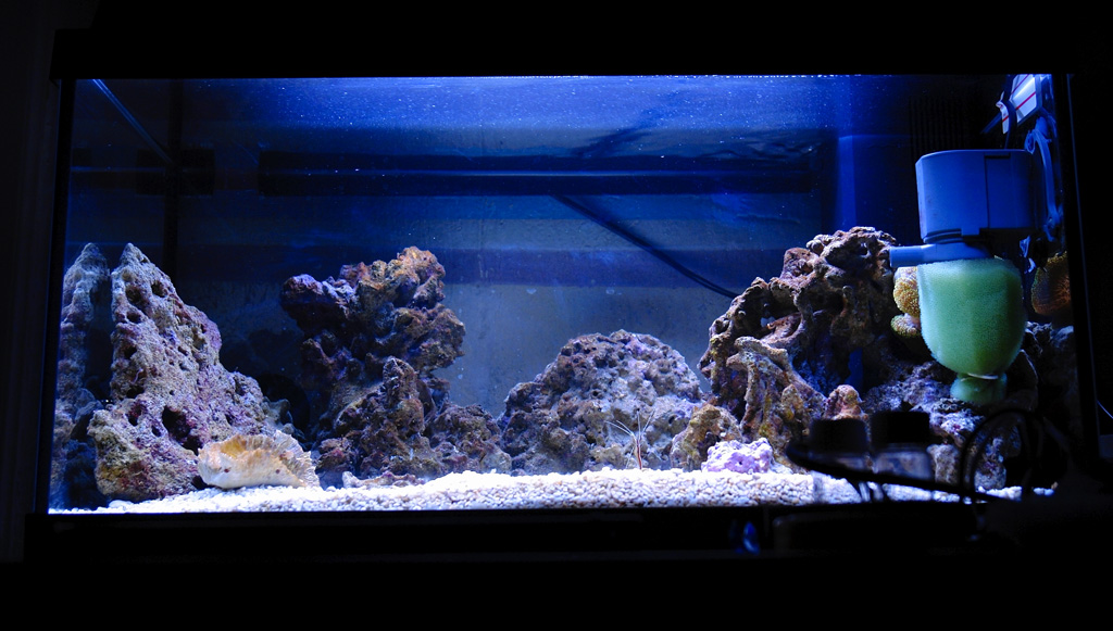 Со дня запуска аквариума прошло 2 недели, проблем с водой и водорослями не наблюдаются , позавчера были подсажены 2 клоуна Бицинтуса, 1 занял ковровую актинию через несколько часов после посадки , второй пока плавает отдельно в актинию не подсаживается, вчера приобрел еще отшельника интересного , крупный красного цвета в крапинку. Воду подмениваю раз в неделю по 6 литров, добавляю кальций, тестами мерял только его, на данный момент счетаю внешний осмотр банки достаточный.