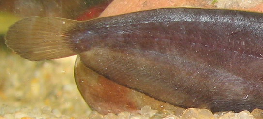 Через три недели (сейчас) отвалилась торчащая из хвоста кость, сом приобрел прежний почти черный окрас, усы восстановились почти на треть прежней длинны.