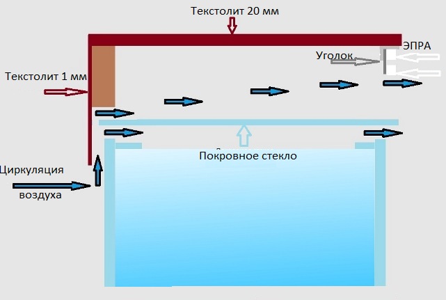 В изготовлении крышки не применялась изоляция контактов – крышка изначально планировалась находиться в сухих условиях. Поэтому для подключения ламп использовались простые клемники. Кто-то может сказать – покровное стекло забирает свет. Может быть, но незначительно. При желании можно изолировать контакты и убрать покровное стекло. Зазор для вентиляции между крышкой и стенкой аквариума остаётся – для вентиляции.