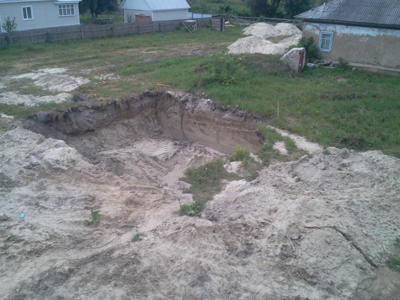Начну с фото того,что есть. А именно есть котлован,который образовался в процессе добычи песка на участке. Размеры(примерно) 8х8х4,5м.