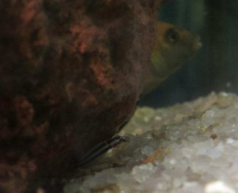 Сегодня заметили в аквариуме с малави 4 малька. По всей видимости, отнерестились ауратусы. НО - 3 малька по окрасу - копии ауратосов, а один - бледно-голубой, почти прозрачный. Вопрос следующий - может ли это быть гибрид, или мы уже 2 нереста пропустили, и это чей-то другой малек? Мальки сидят под камнями, самец-ауратус охраняет гнездо.