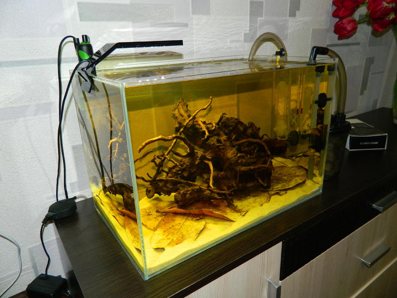 Из обитателей пока никого нет, вот сейчас ищу у нас апистограмм, пока не нашёл то что ищу. Да и не совсем ясно кого можно посадить в такой маленький объем (может подскажите?). Сейчас в аквариуме обычный, мелкий песок и корень азалии. Вода подкрашена листьями кетапанга, лично мне нравится.