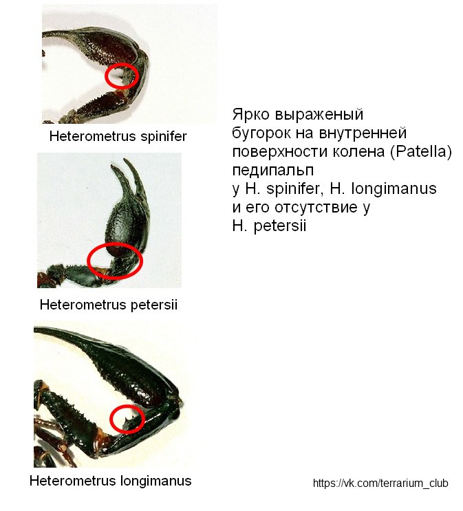 Если не углубляться сильно, то на внутренней поверхности колена (Patella) педипальп у Спинифера есть "рог", а у Петерси он отсутствует.